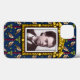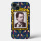 The original artwork by ZoeSPEAK on this iPhone 13 Case features a portrait of the composer Gustav Mahler. The portrait is a hand tinted photograph, surrounded by an illustration of an ornate frame of gold ribbons and little birds. The frame is on a wallpaper background of marine blue, with vertical rows of entwined red ribbons, little brown birds and green leaves.