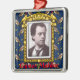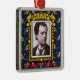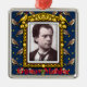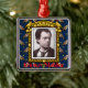 The original artwork by ZoeSPEAK on this Ornament features a portrait of the composer Gustav Mahler. The portrait is a hand tinted photograph, surrounded by an original illustration of an ornate frame of gold ribbons and little birds. The frame is on a wallpaper background of marine blue, with vertical rows of entwined red ribbons, little brown birds and green leaves. Under the portrait is the composer's name in red text.