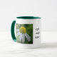 Gute-Besserungs Tasse mit wilder gelb-weisser Kamille auf grünem Hintergrund, hier mit grünem Henkel und Rand. Die Tasse ist auch in anderen Farbkombinationen und Varianten erhältlich (als Bierkrug eher ein Scherz). Sie ist auch hübsch rein weiss oder mit schwarzem Henkel und Rand. Aufschrift: get well soon (gute Besserung).