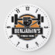 A unique gym or workout room personalised decorative wall clock. A great addition to any home, garage or gym. Also makes a great gift idea.
