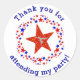 Gymnastics party thank you stickers- Reads 'Thank you for attending my party!' in modern, blue, curved lettering with shadow effect at top and bottom. Red and blue stars circle a faux sequins, red star with a tumbling gymnast pose in the centre. Matches red, white and blue party decor, gymnastics theme, cheerleader theme, or stars theme. Add any custom text you wish. Click Customise option to change text colours, size, and font styles. Cute, tumbling gymnast or cheerleader birthday party thank you favour tags.