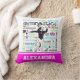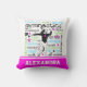 Gymnastics typography throw pillow. Lots of gymnastics words surround this adorable gymnast. It has decorative stars and a custom text field for you to add your own name! The colours are bright in pink, blue, and green to accent the black.