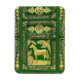 Photograph of a traditional gypsy caravan painted wagon detail with a gold horse on a green painted background, photographed at Appleby horse fair, in Cumbria, England, where gypsies gather every year.