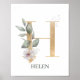 Letter H monogram floral. Letter H in golden brown texture accented with green watercolor compound leaves, flower blossoms and gold dust. Personalised with name in matching font.
