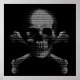 A binary skull and crossbones, great for hackers and programmers! At first glance it looks like a typical pirate skull and crossbones, but look closer. It is made of binary code with hints of leet speak buried in the code.