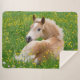 A cute Haflinger foal lies in a green flowering meadow with many yellow buttercups flowers. The chestnut horse breed with a blonde flaxen mane also called avelignese or haffies. A cute and enchanting filly photo taken by Katho Menden. This large sherpa blanket is a gift idea for animal and horse lovers. http://www.zazzle.com/kathom_photo