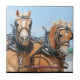 This photograph captures a lively team of Belgian horses as they round a corner in the show arena with cute expressions looking directly at the camera.