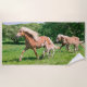 Haflinger mare with frisky foals running together across a pasture in a beautifull landscape. A blonde flaxen chestnut horse breed, also called haffies or avelignese, photo taken by Katho Menden. This beach towel is a gift idea for horse lovers http://www.zazzle.com/kathom_photo -