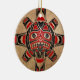 A Haida inspired sun design with a face at the centre. Eight stylised rays reach out from the middle of the star creating symmetrical pattern. The design is coloured the traditional read and black that is highlighted to create a light shine on the surface. A shadow falls onto the beige background making the mask appear to float just above the surface of this ornament. Two hands fall just beneath the tooth filled mouth which gives this native pattern an aggressive and stylish look.