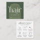Modern boho hair extensions aftercare instructions card with modern fonts, hair care icons and sage green colour scheme. The modern font reads 'hair' and 'aftercare' , the back of the cards includes icons and care tips for hair extensions (can be used for natural hair or faux hair extensions). You can customise these bohemian hair after care cards with your brand colours, logo and business details to make them your own.