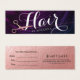 Hair Salon / Hairstylist/ Hairdresser / Beauty Salon / Makeup Artists / Stylists / Wedding Planners / Event Planners / Consultants / Boutique Owners / Fashionistas Appointment Card Templates - Modern Faux Rose Gold Scissors on Elegant Black and Purple Hair Pattern Background.