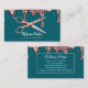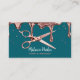 Make a sophisticated and memorable statement with this unique and glamourous business card! The design features an unexpected and stylish teal or deep turquoise background paired with a cascade of shimmering rose gold metallic drip and glitter accents. A realistic pair of rose gold scissors sits prominently on the front, making this card the perfect tool for any professional in the beauty industry.