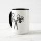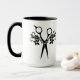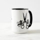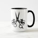 Hairdressers Coffee Mug with Scissors and Flowers in Black on a pure white 15oz Black Handle, Black inside mug with pure White on outside of mug.