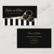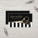 A modern black and white wide vertical stripes business card featuring a pair of gold haircutting scissors. Perfect for the hair and beauty industry. Personalise by adding the name of the hairstylist or certified beautician.