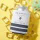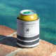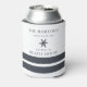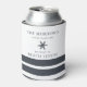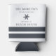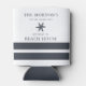 Nautical can cooler features a coastal style starfish and stripes design. Personalise the custom text with a family last name and beach house (or other title) with the year established and location. Hale navy blue and white colour scheme.