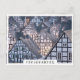 Postcard of the historic architecture of the half-timbered houses with smoking chimneys and the lights on at the start of the evening in the winter in the city Freudenberg near Siegen in Germany with a white edge and in a white box the text 'Freudenberg'.