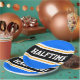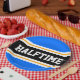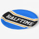 This sporty, athletic design features bold HALFTIME text inside a highlighted wide centre black stripe with white and yellow pinstripes against bright blue outer stripes. The text can be personalised.