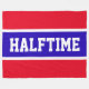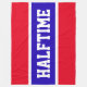 This sporty design features strong bold font inside a highlighted wide bright blue stripe on a bright red background with "HALFTIME" front and centre. The stripe colour and the background colour of this design can be customised/changed by editing the design. The text can be personalised.