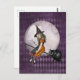 A Halloween Witchy Alice rides her broom across the moon, with the Cheshire Cat in tow.
