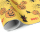 Autumn or Halloween themed wrapping paper with Jack o' lanterns, scary trees, cat, Boo and more.