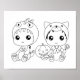 Adorable babies dressed in Halloween costumes. The one on the left is dressed as a dragon. The one on the right is wearing a cat costume with a big bow. A curved pumpkin sits between them and just a little behind. Made for easy colouring.