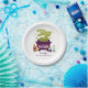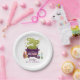 Cute halloween theme baby shower paper plate featuring illustration of a purple cauldron with green smoke coming out. The text says "a baby is brewing." Perfect for a shower in the fall for a girl.