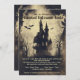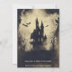 The Halloween party invitation features a spooky, immersive design with a haunted house nestled in the middle of a dark, eerie forest. The house is surrounded by twisted, leafless trees, with bats circling in the murky, fog-filled sky. The scene is rendered in haunting greys and eerie yellowish hues, creating a ghostly glow that adds to the chilling atmosphere.