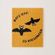 Cute little bats wishing a happy 'bats off to Halloween' in this festive digital illustration.
