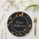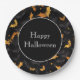 Halloween party paper plate is shown with a festive bats print.