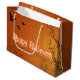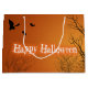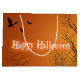 A silhouette Halloween illustration: Spooky black bats and creepy trees with a drippy "Happy Halloween" Greeting on a mystic background.