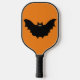 Pickleball Paddle printed with Black Bat artwork design image by TheFabricSeal at Zazzle is a cute and simple lone black bat with background colours of Halloween Orange and Halloween Purple illustration drawing silhouette style with peekaboo peering khaki green and pumpkin orange eyes looking out for friends and prey alike and a cool dark Halloween night of adventure, goblins, ghouls and ghosts.