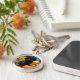 Keychain featuring an adorable black cat wearing a witch’s hat! This little cutie poses with a pumpkin. Autumn leaves carpet the forest floor. A purr-fect gift for Halloween celebrations!