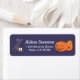 Cute black cat is holding a lantern and looking at a pair of animated pumpkins. One of the pair, a large round pumpkin, is smiling at the kitten, the other, tall slim pumpkin, appears to be spooked by a tiny spider. Customizable text.