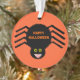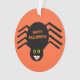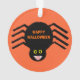 This awesome acrylic ornament features a spooky black spider with eight hairy legs, yellow eyes with big black pupils and its mouth open showing its fangs. There is orange text that reads “Happy Halloween” and a matching orange background.