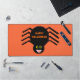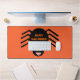 This awesome desk mat features a spooky black spider with eight hairy legs, yellow eyes with big black pupils and its mouth open showing its fangs. There is orange text that reads “Happy Halloween” and a matching orange background.