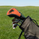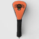 This awesome golf driver cover features a spooky black spider with eight hairy legs, yellow eyes with big black pupils and its mouth open showing its fangs. There is orange text that reads “Happy Halloween” and a matching orange background.
