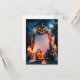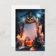 Halloween invitation card exudes a festive and spooky charm, perfect for setting the tone for a Halloween celebration. The central blank space awaits your personalised event details, flanked by glowing carved pumpkins, warm candlelight, and scattered autumn leaves. Overhead, a string of twinkling lights and fluttering bats add to the eerie yet inviting atmosphere. The dark night sky background completes the Halloween theme, making this card an ideal choice for inviting guests to a memorable Halloween party.