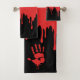 Halloween towel set with faux red blood dripping illustrations and a spooky hand full of red blood drips on a black background. Ideal bathroom decor for this October Holiday.