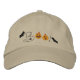Fun hat embroidery features the word boo with spiders, pumpkins and black bats.
