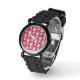 This awesome watch features a cute little white ghost with black eyes and a black mouth that is wide open. Each ghost sits on either an orange coloured square or a purple coloured square and there is either orange or purple text in each square that says Boo! The result is a pattern of squares and ghosts.