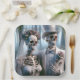 A skeletal bride and groom dressed in wedding attire complete with floral accessories and a top hat set against a misty forest backdrop.