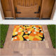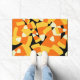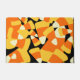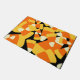 Doormat Entry Door Way Mat printed with Halloween Candy Corn Seamless Pattern artwork design illustration by TheFabricSeal at Zazzle.com is filled with popular yummy delicious looking small pyramid shaped candies with bands of colors in white, yellow and pumpkin orange color palette tones. Candy Corn’s traditional colors represent the colors of fall harvest, corn on the cob, with the wide yellow band end resembling a corn kernel. This classic candy is known for being Halloween’s most contentious and popular sweet treat.