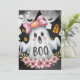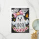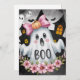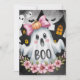 A Halloween card with a watercolor style kawaii ghost wearing a pink coquette bow. Test reads BOO! There are bats and a haunted house in the background.
