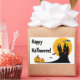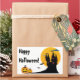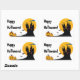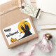A customisable set of rectangle stickers with the words "Happy Halloween!" and a castle silhouette against a beautiful full moon with clouds and bats and two Halloween pumpkins.
