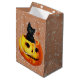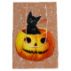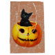 Halloween Cat in Pumpkin gift bag with the very cute little black cat sitting in a pumpkin saying, "Boo!" on a Halloween background pattern.