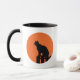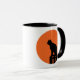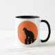 A black cat sitting on a fence in front of a full orange moon for Halloween.