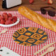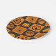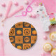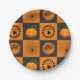 Halloween chessboard design in orange and black with jack-o-lantern, witch, full moon with bats and a spider net with a halloween spider.