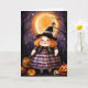 Child-like witch figure dressed in a striped dress and hat, surrounded by glowing jack-o'-lanterns, with a full moon and dark trees in the background.