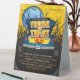 Halloween Church Trunk or Treat Event Marketing Table Tent Sign Featuring Blue Car Trunk Filled With Candy & Pumpkin, Blue Moon, Fence & Trees. Customise To Your Liking.