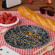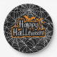 A Happy Halloween Paper Plate In Black With White Cobwebs And Orange Bats For Halloween Parties